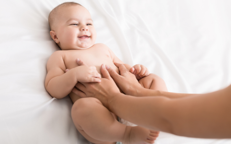 Colocar o bebê de bruços sobre o antebraço (posição do “avionzinho”) ou deitado de barriga para baixo sobre o peito do cuidador pode trazer alívio. O calor corporal e a leve pressão ajudam a relaxar a musculatura.